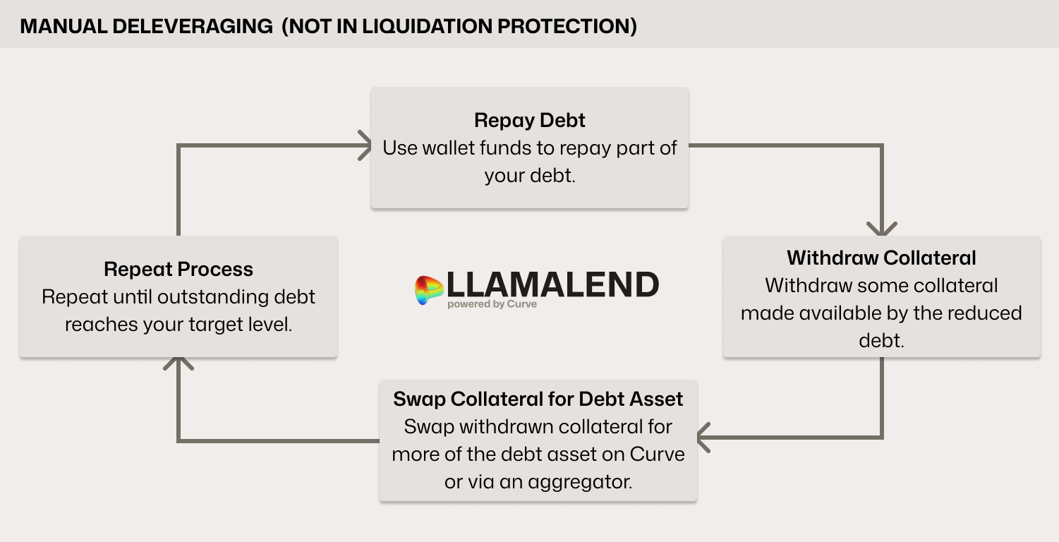While the UI typically allows deleveraging in a single transaction, you can manually deleverage your position. The process differs depending on whether your loan is in liquidation protection mode.