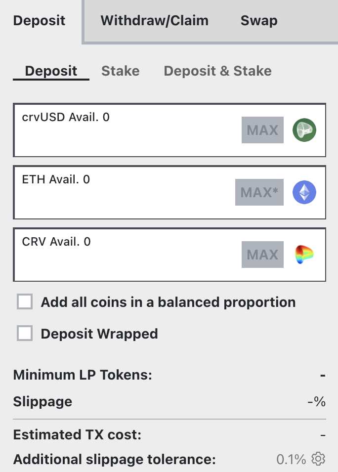 Посетите страницу депозита (https://curve.fi/#/ethereum/pools/factory-tricrypto-4/deposit). Вам потребуется как минимум один из трех токенов в пуле для внесения. Пул TriCRV состоит из CRV, crvUSD и ETH.